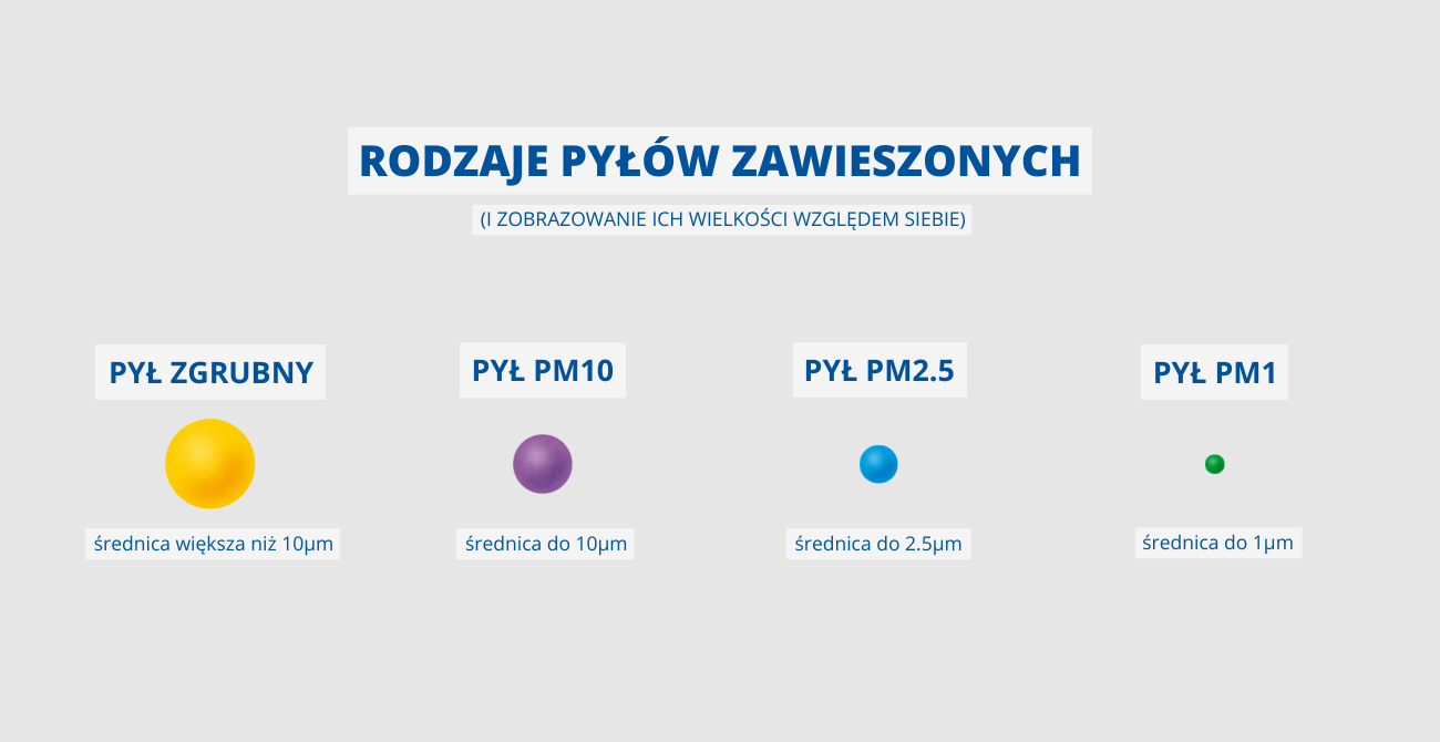 PM10, PM2.5 oraz PM1 to z kolei umowne kategorie opisujące zawarte w powietrzu pyły trudno opadające (PM – Particulate Matter, pyły zawieszone). Przez PM10 rozumie się zanieczyszczenia o średnicy do 10µm (mikrometrów, czyli tysięcznych części mm), przez PM2.5 – zanieczyszczenia o średnicy do 2,5µm a przez PM1 – zanieczyszczenia o średnicy do 1µm.