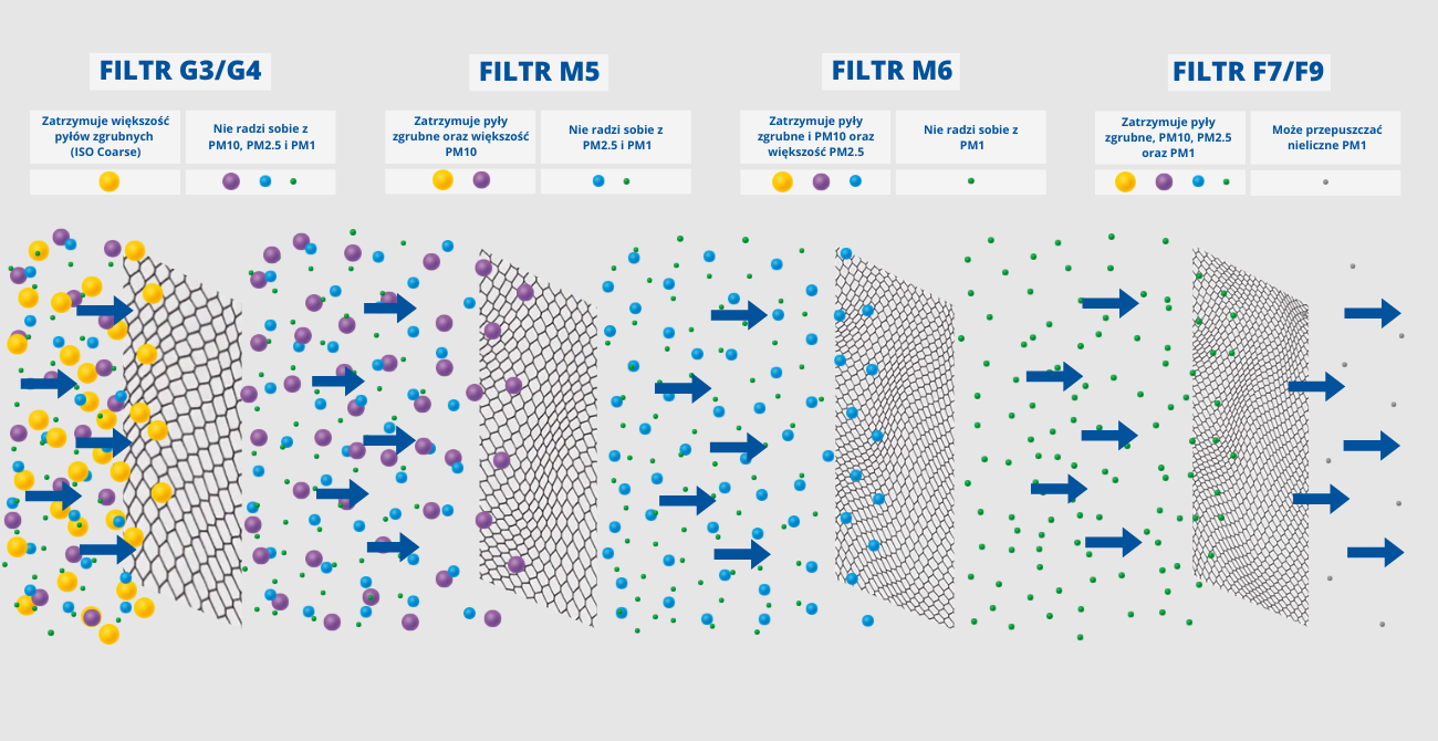 Montując filtry klasy M6 czy F7 należy się jednak liczyć z tym, że z racji tak wysokich stężeń pyłów klasy PM2.5 (i PM1) żywotność takich filtrów w polskich warunkach będzie niestety niższa niż średnia europejska.